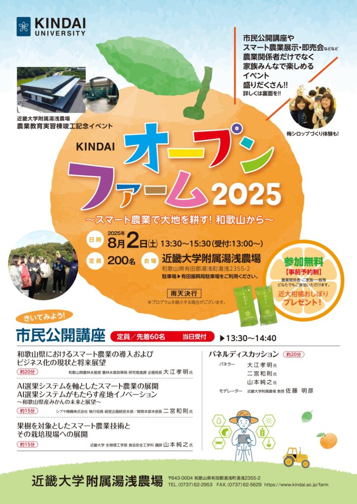 スマート農業など、次世代の農業教育の場として、柑橘や果樹の栽培研究を行っている湯浅町の近畿大学附属湯浅農場で・来月(8月)2日土曜日に、「KINDAI(キンダイ)オープンファーム」が開催されます。