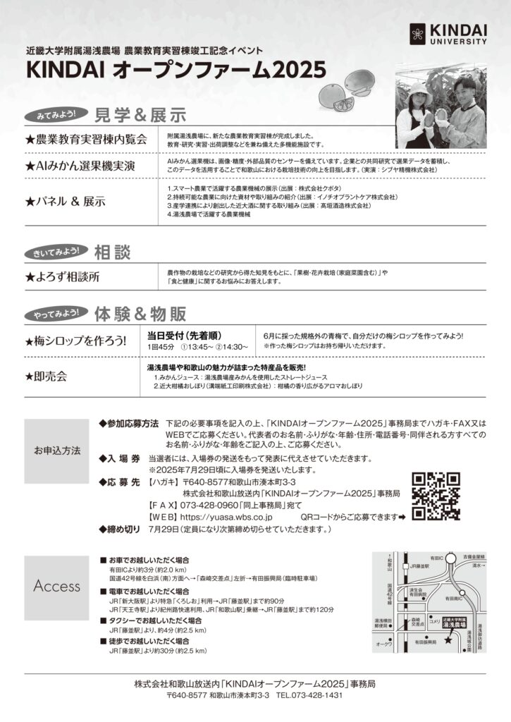 農場では、農業関係者や、研究に興味のある方などに、気軽に参加してほしいと呼びかけています。参加は無料ですが、予約が必要です。近畿大学附属湯浅農場のホームページからアクセスできる特設サイトの応募フォームから申し込むか、オープンファーム事務局へ、ハガキか、FAXで申し込むこともできます。定員は200人で、先着順に受け付けられます。