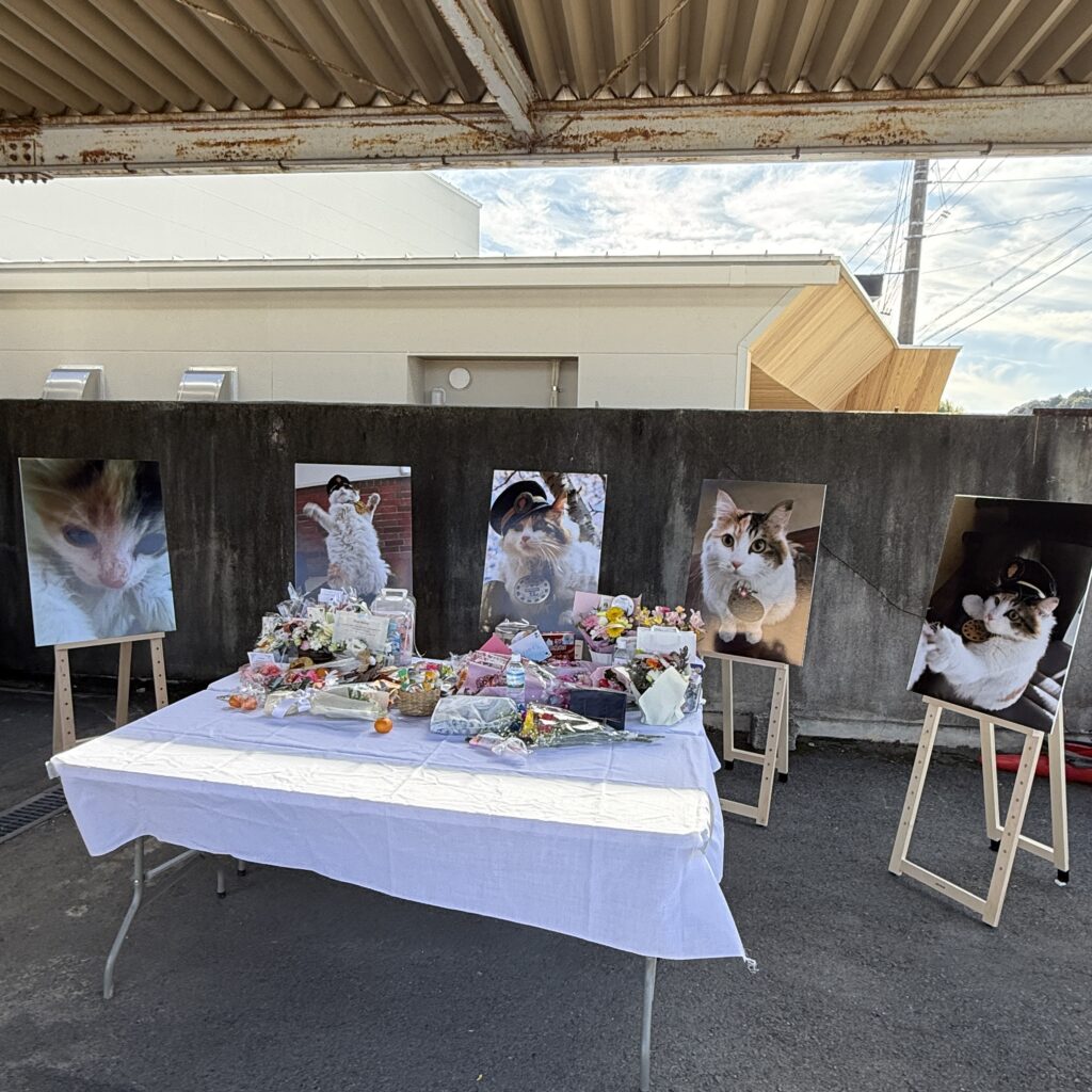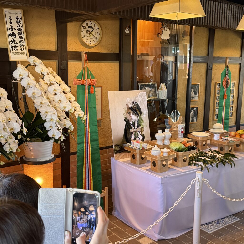 先月(11月)20日15歳8ケ月で亡くなった和歌山電鐵社長代理のニタマ駅長の社葬がきょう(13日)貴志川線貴志駅で行われました。社葬では近くの大国主神社の宮司が祝詞を読み上げ葬儀委員長を務める和歌山電鐵の小嶋光信社長や地元、紀の川市の岸本健市長らが弔辞を述べ、ニタマ駅長の功績を讃え、冥福を祈りました。駅にはニタマ駅長の死を悼むフアンや鉄道利用者らが多く集まり冥福を祈りました。会場の献花台には多くの花束や手紙、キャットフードなどが供えられ、遺影の写真は帽子をかぶり、マントを羽織り、凛とした表情で、駅長代理のよんたまも参列しました。ニタマ駅長は名誉特別駅長に就任する辞令が発表されました。