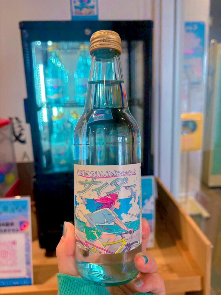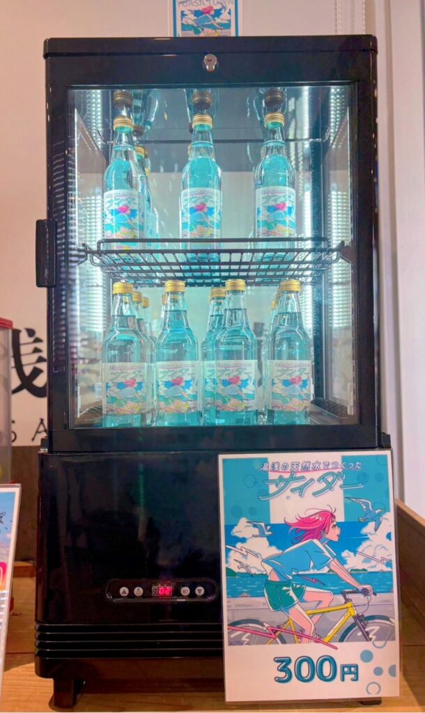 また、観光協会が、レンタルサイクル事業も手がけていることから、サイダーの瓶のラベルには、湯浅町出身のデザイナー・佐藤友哉(さとう・ともや)氏による町内の海沿いの道を自転車で軽やかに走る女性のイラストが描かれ、疾走感と、炭酸飲料の爽快感が表現されています。