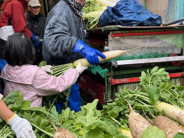 子どもたちは、今年(2025年)秋、和歌山市で、特産の布引大根(ぬのひきだいこん)を生産しているロータリークラブの会員の山本善昭(やまもと・よしあき)さんの畑で、大根の種まき体験をしていて、その大根が大きく育ったことから、きょうは、山本さんの指導で、1人2本ずつ、大根を土から引き抜き、水洗いの手伝いをしました。子どもたちは、うれしそうに、大きく育った大根を収穫し、大根がたくさん入った豚汁を、会員の大人たちと味わいました。