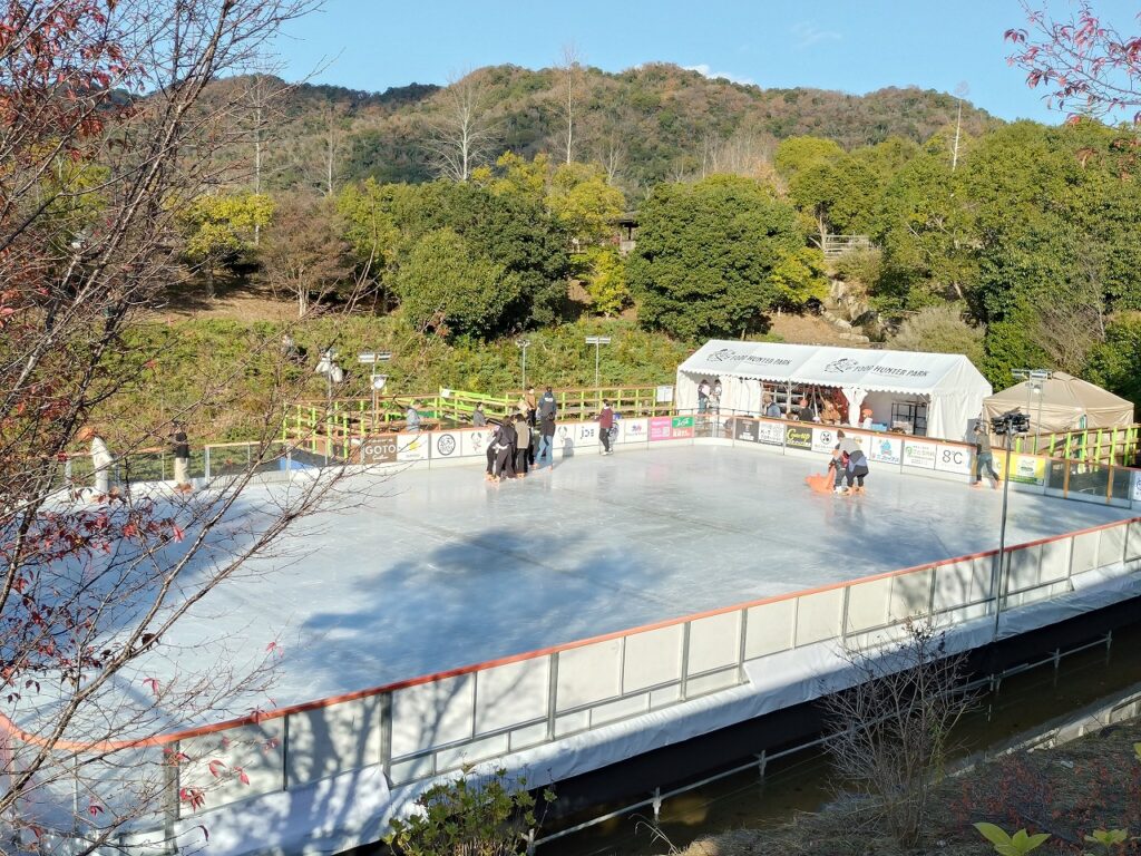 スケートリンクは、四季の郷公園の物産販売所脇の修景池(しゅうけいいけ)の上に設置され、縦25メートル・横16メートルの400平方メートルの広さがあり、最大で100人が同時に滑れるということです。