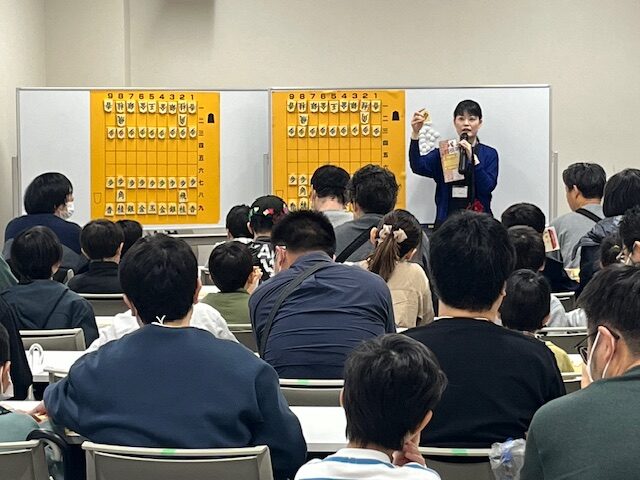きょうは、井田明宏(いだ・あきひろ)5段ら、プロ棋士も参加して、小中学生を対象にした将棋教室や対局指導も行われました。将棋教室の村田智穂(むらた・ちほ)女流3段のクラスでは、小学生らが、親子で解説を聞きながら将棋の楽しさを学んでいました。