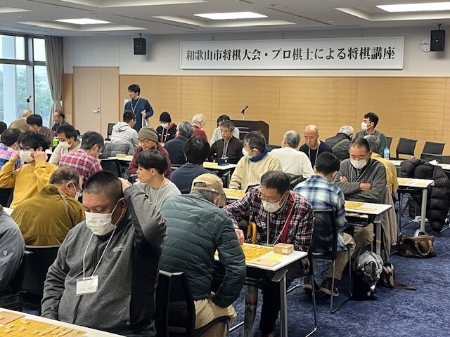 和歌山市の主催で開かれたもので、小学生以上の子どもの部と高校生以上の一般の部で、それぞれ対戦が行われました。参加した将棋愛好家の市民らは、それぞれ10分の持ち時間で駒を進め、対戦に集中していました。