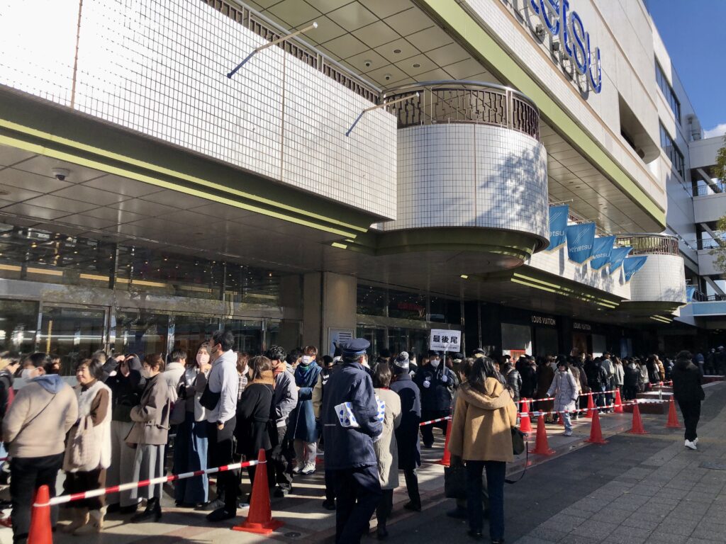 けさの和歌山市は、最低気温が4・2度と2月下旬の寒さとなりました。こうした中、JR和歌山駅前にある近鉄百貨店和歌山店では午前8時頃から、4カ所ある店舗入り口に厚手のコートやマフラー姿の買い物客が行列をつくりはじめ、10時の開店前にはおよそ1600人が列を作りました。