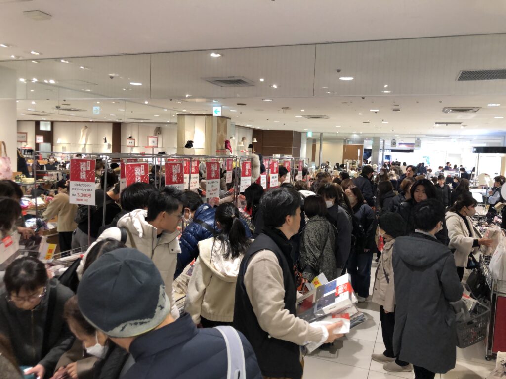 福袋を品定めする人で賑わう1階フロア(近鉄百貨店和歌山店にて)