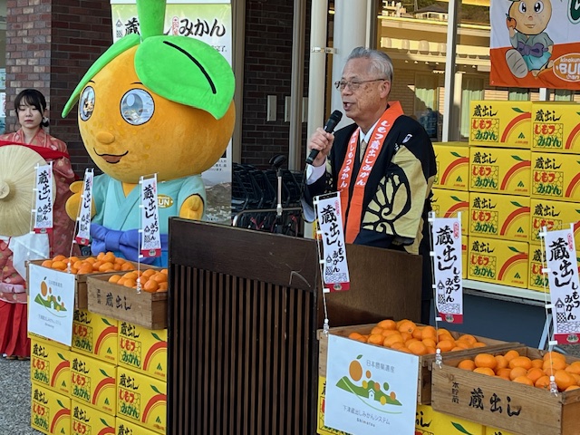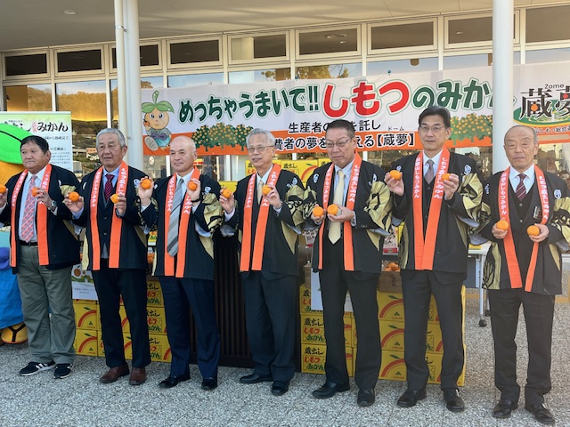 これは県農業協同組合ながみね地域本部や海南市などでつくる地域ブランド推進連絡会議が開いたものです。海南市下津町にある道の駅、海南サクアスで開かれた結団式では海南市の神出政已市長が、「しもつみかんを待っている消費者においしいみかんを売り込んでいきましょう」と出席したメンバーを激励しました。また、ながみね地域本部の岡野清隆(おかのきよたか)本部長も「しもつみかんをPRしていこう」と挨拶しました。そして地域ブランド推進連絡会議の岡畑浩二(おかはたこうじ)会長がPRにかける決意を述べキャンペーンのスタートさせました。年明けから出荷が始まる「しもつみかん」は年内に収穫したものを土蔵の蔵などで保管した「蔵出しみかん」として人気で、甘みと酸味が絶妙のタイミングなのが特徴です。キャンペーン隊は来週京阪神の市場や量販店を回りPRを行うほか東京や北海道、新潟、仙台でも市場や自治体を回るなどして、しもつみかんをPRしていくことにしています。下津蜜柑は地域団体商標登録されているほか、下津蔵出しみかんの生産から出荷までのサイクルが日本農業遺産に認定されています。また昨年隣の有田みかんの生産地、有田地域とともに下津地域の山の斜面を利用した石積み階段でのみかんの生産システムが世界農業遺産に認定されるなどこの地域のみかんのブランド化が進んでいて関係者はより一層消費者へのブランドの浸透を目指しています。