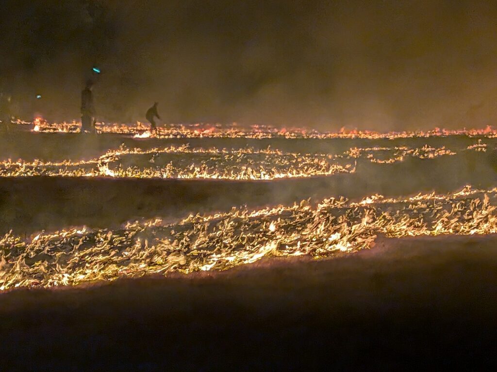 火は、またたく間に燃え広がり、一面がオレンジ色の炎に包まれる幻想的な光景へと一変、およそ1時間かけて、10万平方メートルの芝を焼きました。