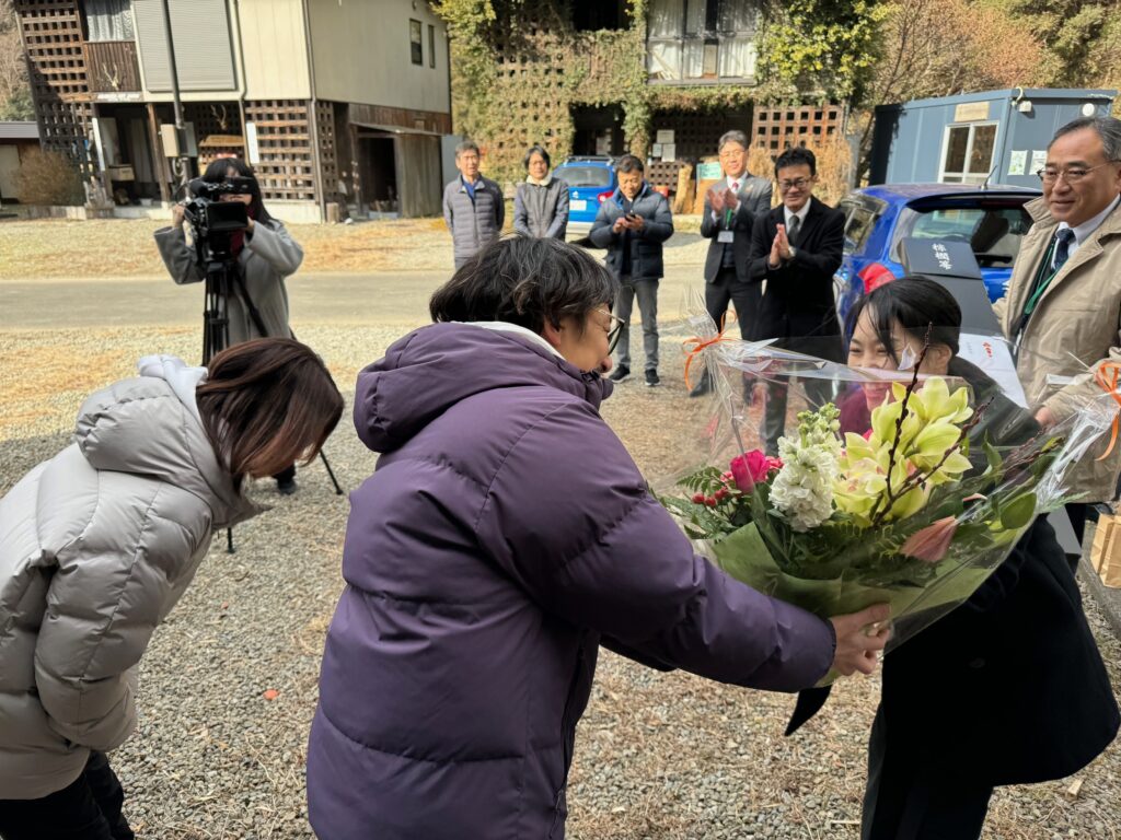 田辺市龍神村小家(おいえ)の「アトリエ龍神の家」で行われた式典では、きのくに信用金庫の岩橋儀幸(いわはし・よしゆき)専務理事や大学関係者、田辺市龍神行政局の職員らが大阪から移住を決めた50代の夫婦に花束を渡して感謝の気持ちを伝えました。夫は映像制作とともに作家活動に取り組む中で静かな環境を求めていたということで、「山奥に暮らせるのか不安もあったが地元の人の熱意と誠実な人柄に触れて移住を決意した。今後の創作活動につなげていければ」と期待を述べました。龍神村移住促進プロジェクトは、きのくに信用金庫と和歌山大学が締結した包括連携協定に基づき、3年計画で進められています。これまでに学生らによるPR動画の制作と上映。2年目となる去年は、村の生活を肌で感じる 「移住体験ツアー」を実施してきました。プロジェクトでは今年も体験ツアーを計画していて、ひとりでも多くの移住・定住者を増やせるよう活動を続けていくことにしています。