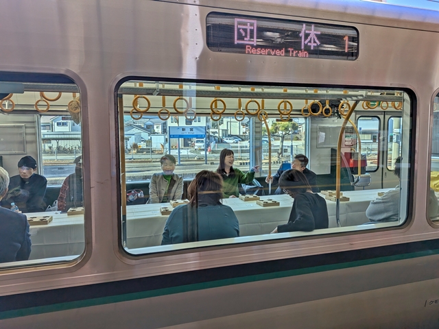 車両は通勤電車として使われるロングシート車両の真ん中にテーブルを配置し、お酒やお弁当などを置けるようにしたもので、乗客らは車窓から見える雄大な太平洋を楽しみながら、新宮市の尾崎酒造の日本酒「太平洋」や梅酒などを味わいました。
