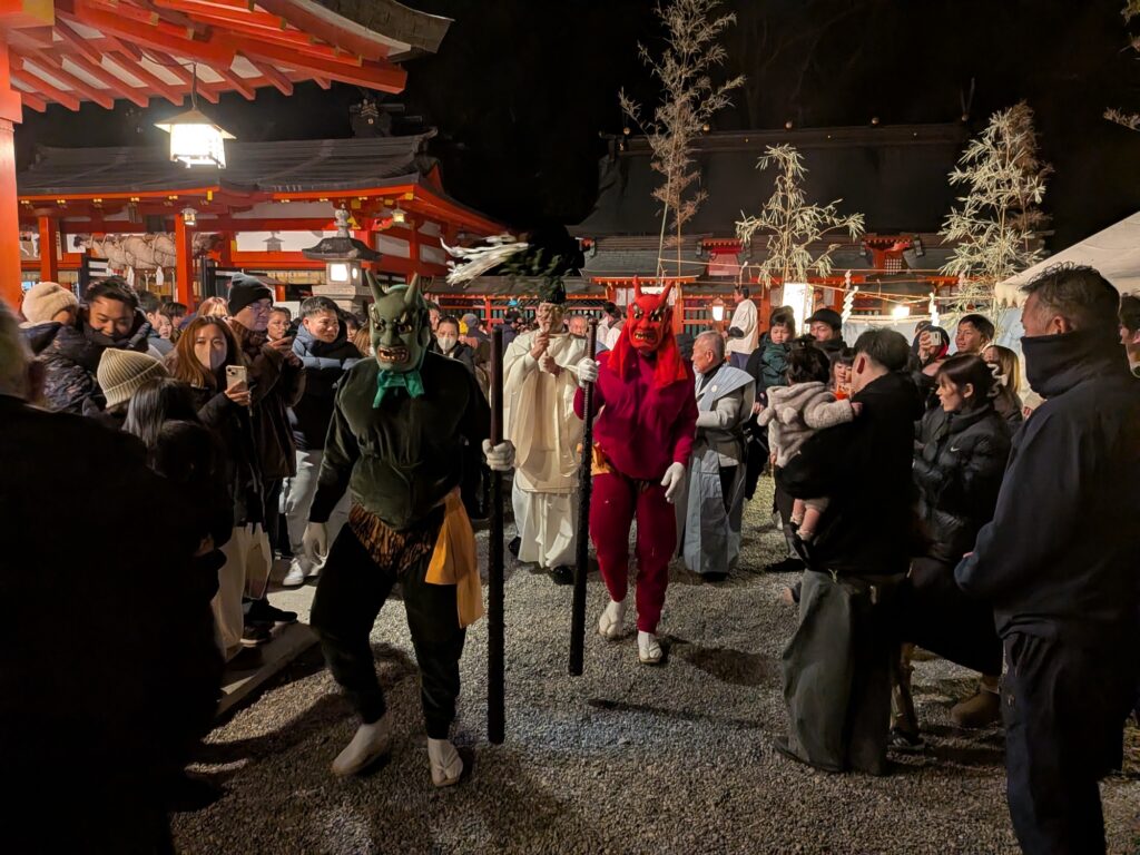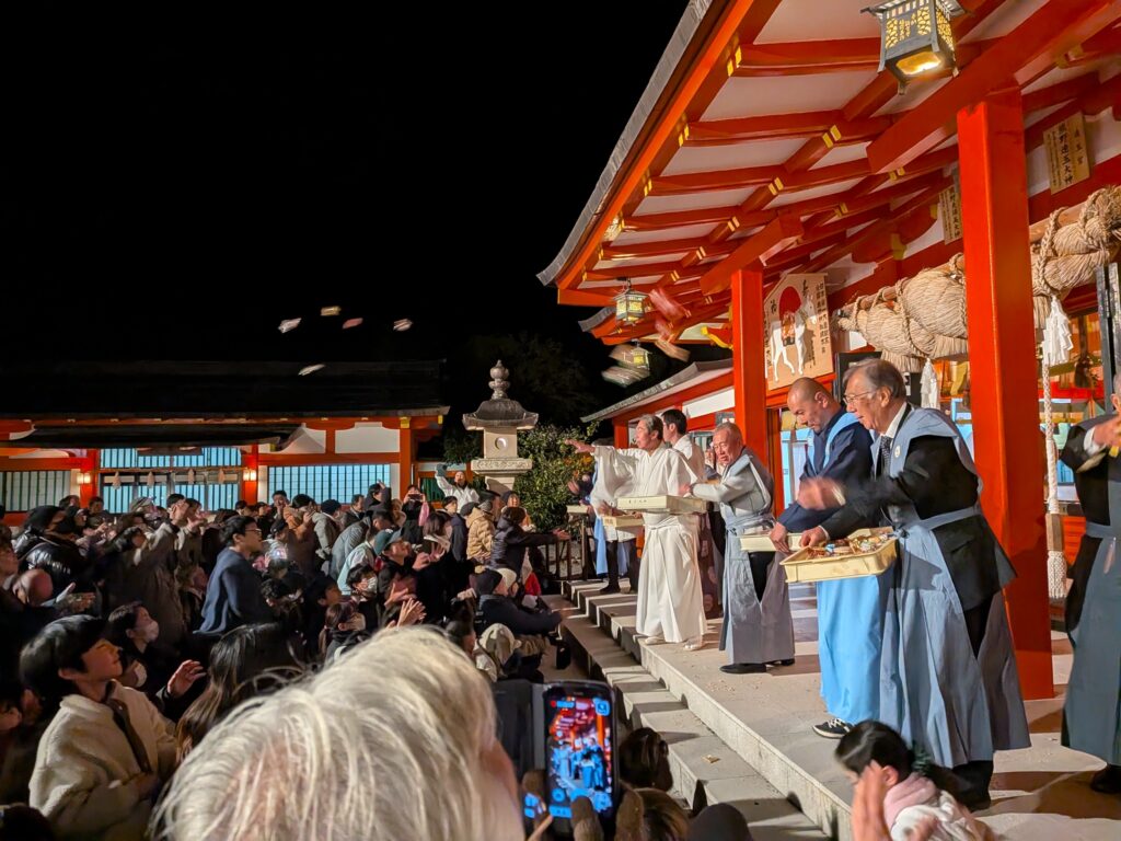 追儺式では、参拝客らに福豆が配られ、「豆ちょうだーい」という子供の大きな声が境内に響き渡っていました。