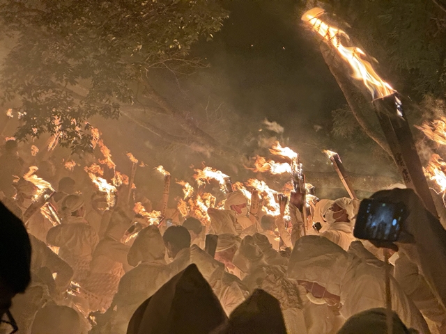 きのう午後7時ごろ、神倉山(かみくらさん)の山上にある神倉神社のご神体・ゴトビキ岩前の拝殿内で古式にのっとって起こされた火が、上り子(のぼりこ・又はあがりこ)と呼ばれるおよそ1500人の白装束の男たちの松明に分けられました。