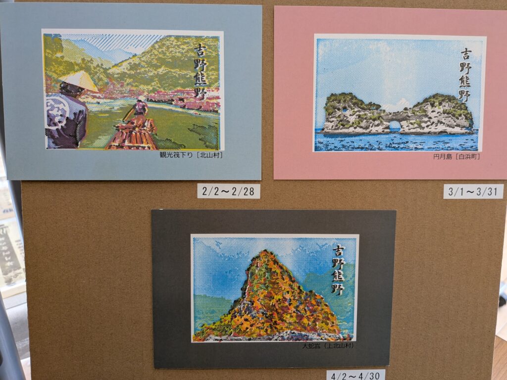 図柄は2月が北山川の筏下り、3月が白浜町の円月島、4月が大台ケ原の紅葉となっています。
