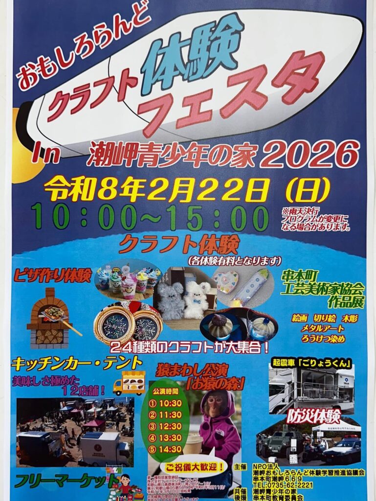 県立潮岬青少年の家の「クラフト体験フェア」は、22日・午前10時から午後3時まで行われます。入場は無料ですが、各クラフト体験は有料となっています。詳しくは、潮岬青少年の家、電話0735・62・0182、また、インスタグラムなどでも情報を発信しています。