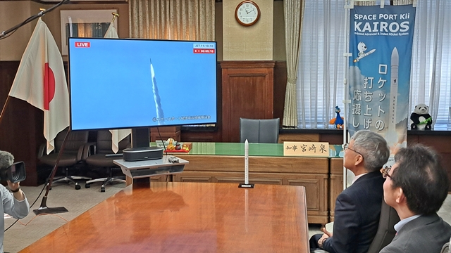 和歌山県の宮﨑泉知事は、きょう(5日)午前11時10分に串本町の「スペースポート紀伊」から打ち上げられた、民間初の小型ロケット・カイロスロケット3号機のもようを、友井泰範(ともい・やすのり)副知事や北廣理人(きたひろ・まさと)知事室長らと県庁の知事室で見守りました。