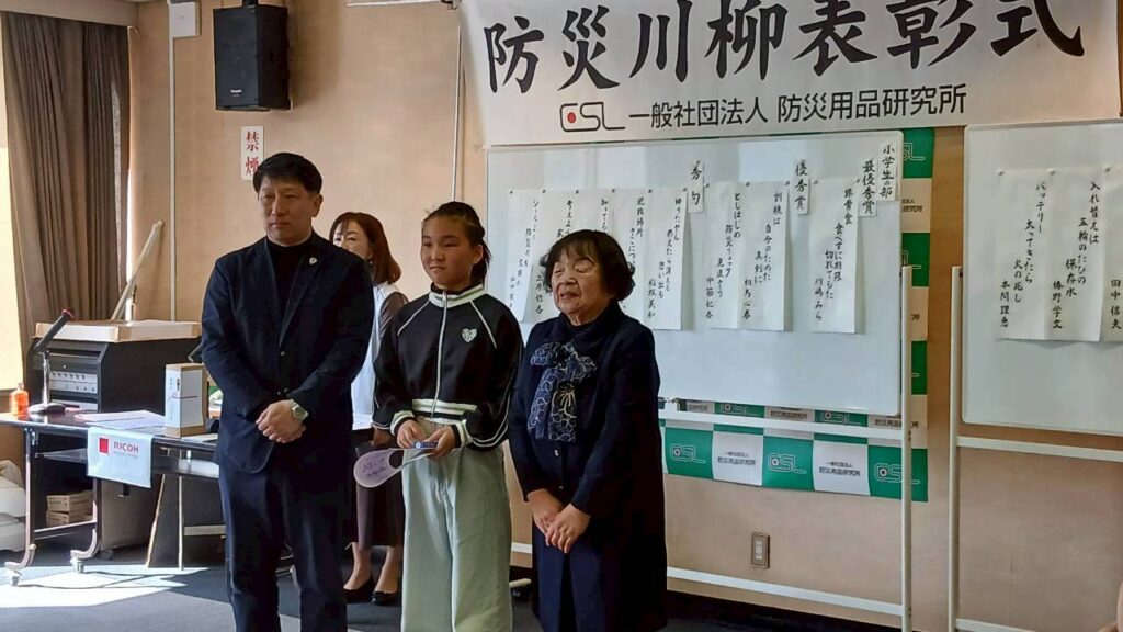 小学生の部で入賞した子どもたちは挨拶で「防災意識が高まった」とか「防災を考えるきっかけとなった」などと話して受賞を喜んでいました。防災用品研究所では今後も川柳を通じて防災への啓発を行いたい考えです。