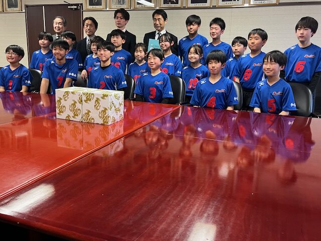 市役所を訪問したのは、大会に出場する市立三田(さんた)小学校6年の上村奏斗(うえむら・かなと)選手ら18人や監督、保護者らで、子どもたちは、尾花市長に、自己紹介をし、試合にかける意気込みを伝えました。