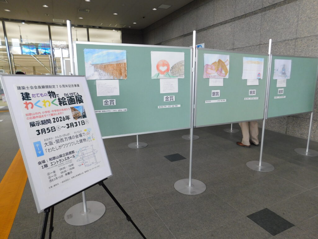 和歌山市内の小中学生が描いた「大阪・関西万博の会場で、わくわくした建物」の絵画作品の中から、金賞と銀賞が選ばれ、このほど、和歌山県立図書館で表彰式が行われました。