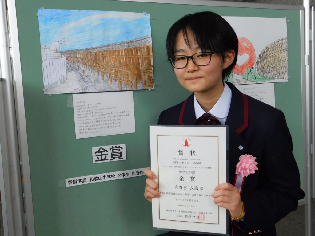 金賞を受賞したのは、中学生の部が智辯学園和歌山中学校2年、吉野谷衣織(よしのや・いおり)さん14歳で、「万博には8回行って大屋根リングをしっかり目に焼き付けた。1本1本のはりや柱を描くのは大変だったけど、作った方々の思いがこもっていて、感動した。将来は、建築デザイナーだったり、医学の道にあこがれもある」と話しました。