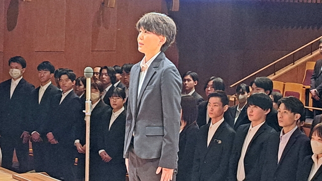 続いて、職員の宣誓が行われ、有田川町出身の一般行政職で観光交流課に配属される中西祐帆(なかにし・ゆうほ)さん30歳が「県民の皆様が住み続けたい“心豊かな和歌山“の実現こそ私たちの使命です。笑顔あふれる和歌山の実現に向けて、誠心誠意取り組みます」と誓いの言葉を述べました。