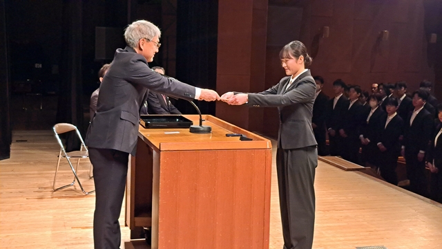 式では、新入職員を代表して、みなべ町出身の林学職で林業振興課に配属される新田あか音(にった・あかね)さん22歳が、宮﨑泉知事から辞令を受けとりました。