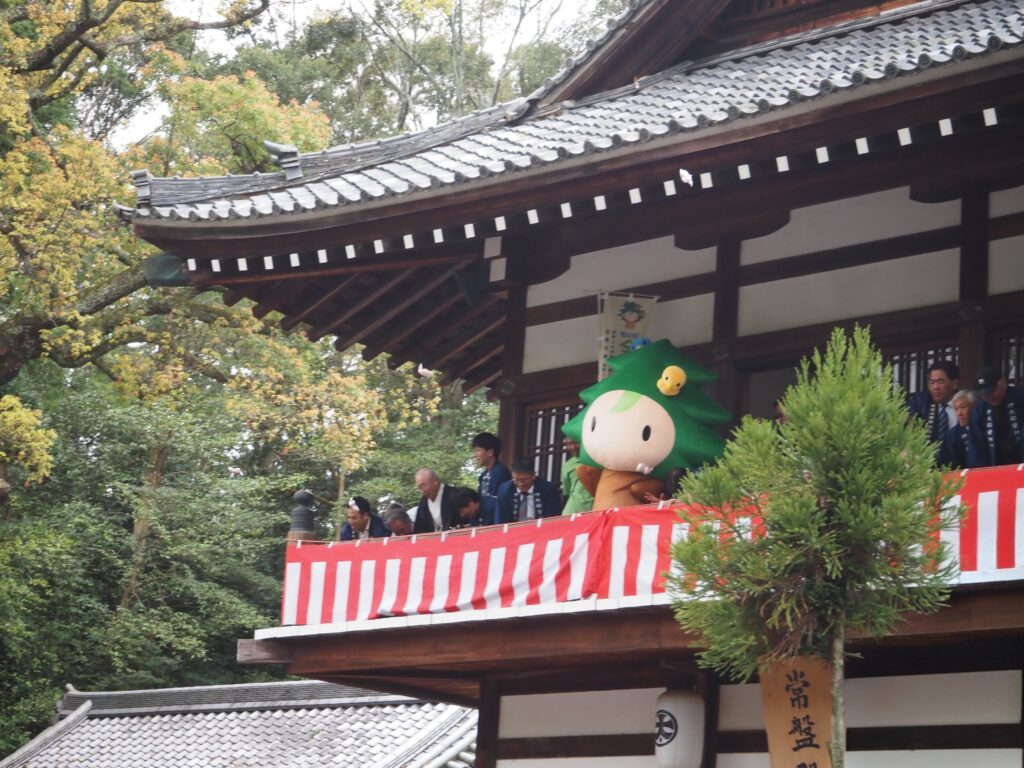 餅まきに参加する紀の国森づくり大使のキノピー