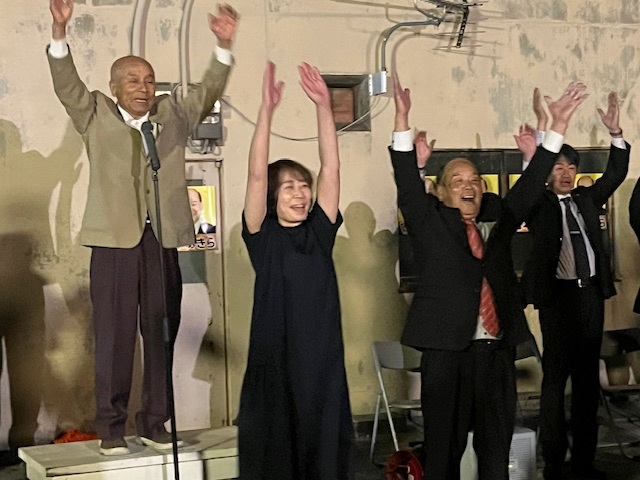 6選を果たした岡本町長は、町内の選挙事務所で、支持者らとバンザイをして喜んだあと、「一人暮らしの高齢者の見守りのほか、若い人にも住んでもらえる施策に取り組み、世界一元気な町を目指していく」と決意を述べました。