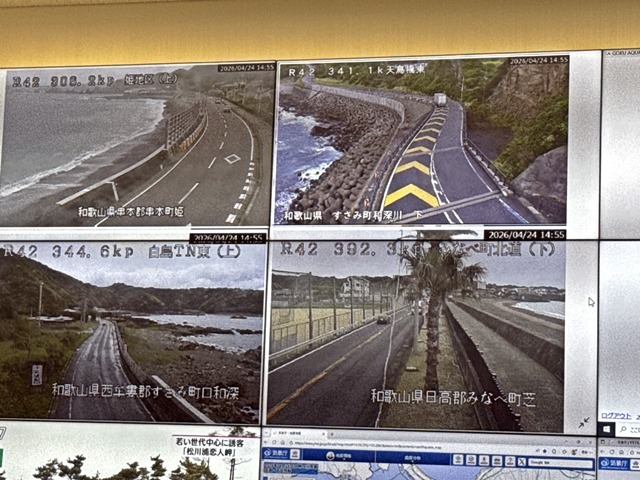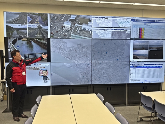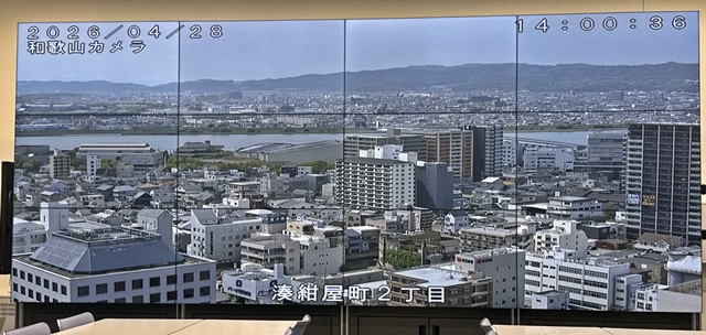 和歌山市は、このほど(2026年3月)6132万円あまりをかけて、消防庁舎6階の災害対策本部室に設置していた大型モニターを更新し、市役所屋上や沿岸部などに設置されたカメラやドローンからの中継画像、国土交通省の道路・河川の監視カメラの画像などを12枚の液晶モニター画面を使って集中して表示できるようになりました。
